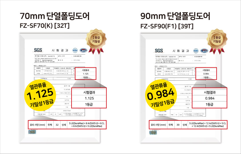 90mm 단열폴딩도어(39T삼중유리적용)가 기밀성 1등급, 열관류율 0.984로