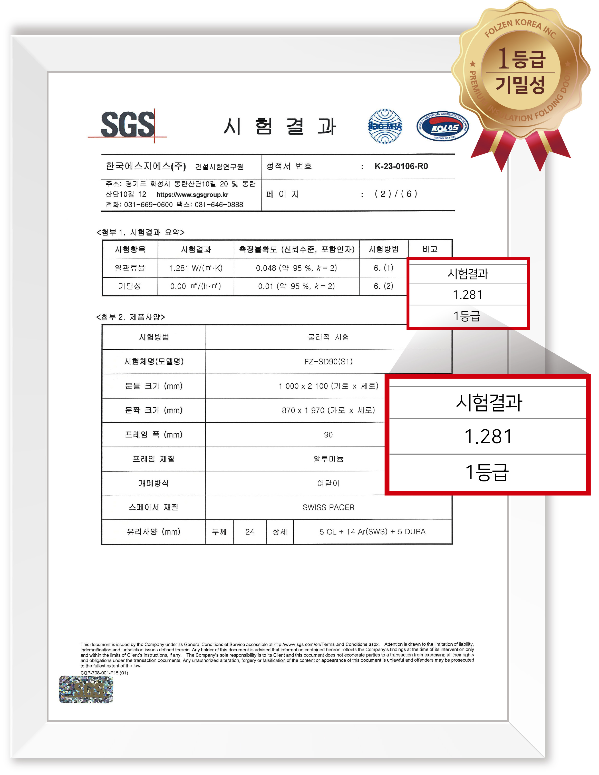 폴젠코리아, 90mm 시스템도어(24T 일면 로이복층유리 적용) 시험성적서 획득!!