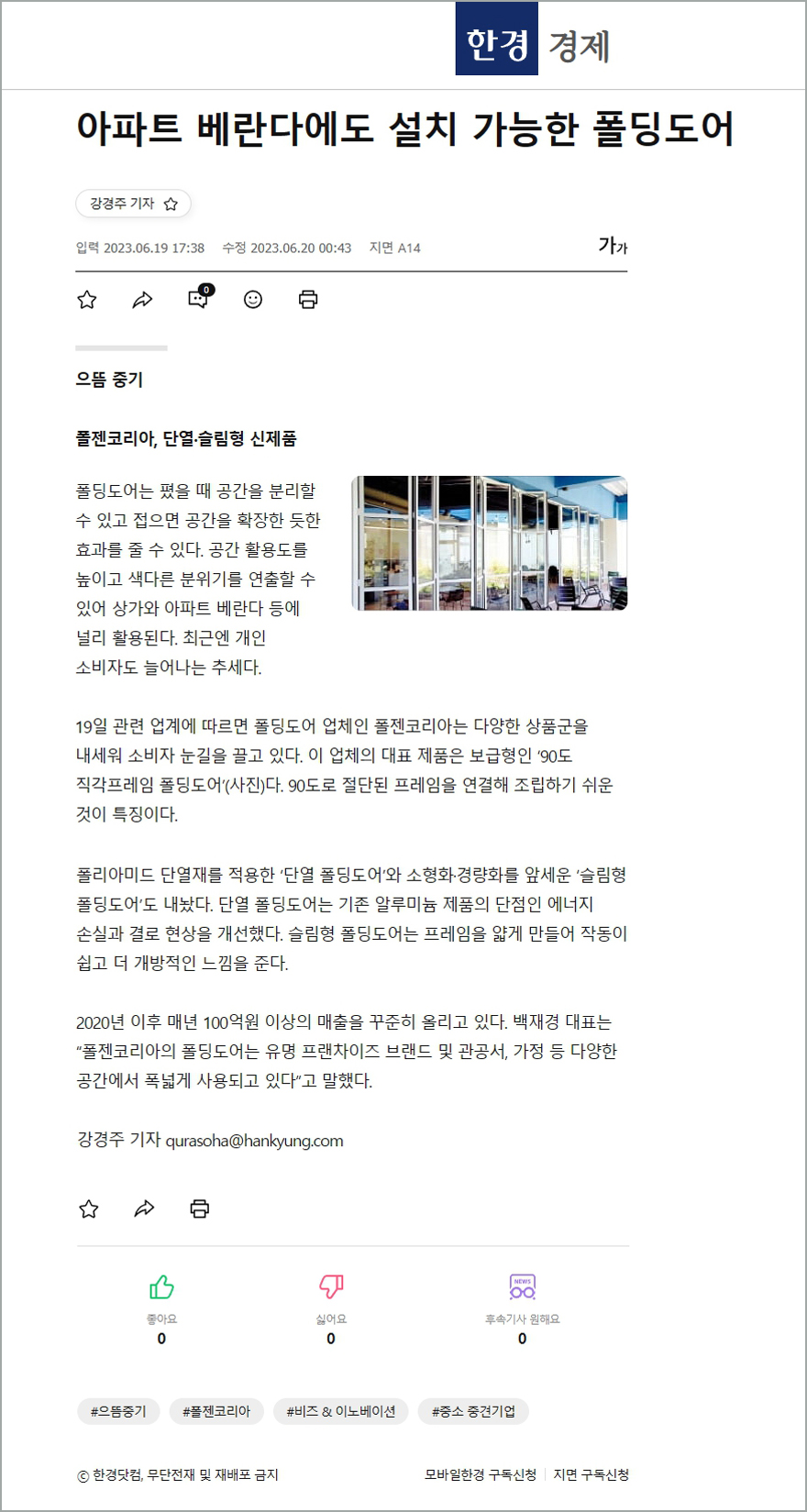 폴젠코리아, 한국경제 _ 단열 폴딩도어, 슬림형 폴딩도어 신제품 기사 등재!!