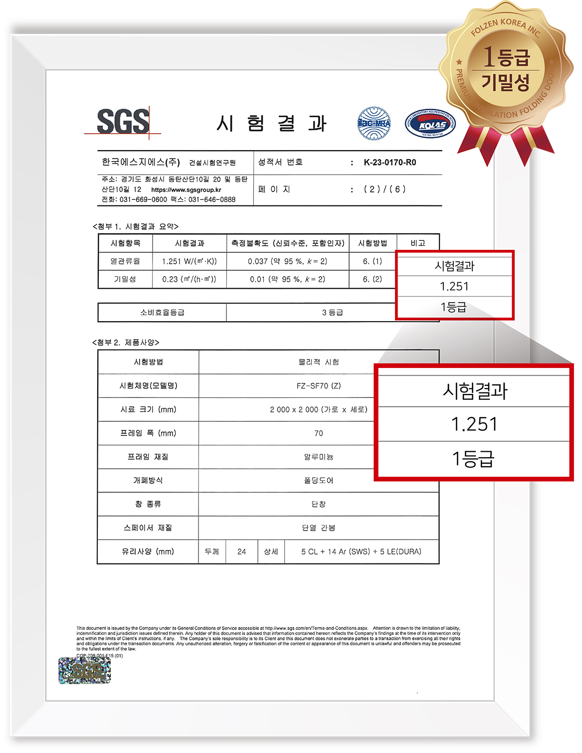 효율관리기자재 테스트에서 기밀성 1등급, 열관류율 1.251로