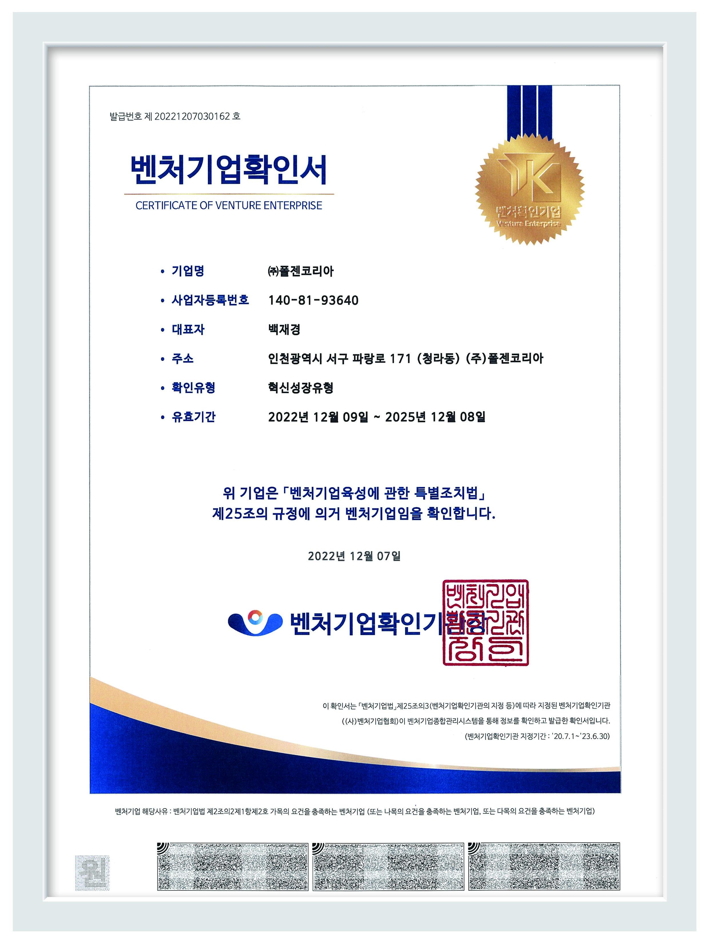 폴젠코리아, 2022년에도 벤처기업확인서를 받았습니다!