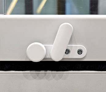 손을 사용할 필요없이 발을 이용해 편리하게 여닫을 수 있는 버튼식 잠금장치. 하단 버튼을 누르면 도어 열림, 버튼 옆 하단 레버를 내리면 도어 잠김